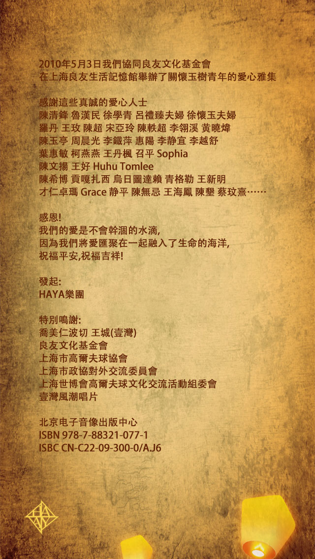 玉树在藏语中有“遗址”之意,它曾是承载藏族风物的宝地,却在地震中化为一片废墟,满目疮痍,目之所及不见一丝生机,只余伤痛悲声。“当清晨的第一缕阳光亲吻大地的时候,这个万物繁衍生息的家园应该是一片和谐的绿洲,当我们闭上眼睛去看心灵,它也应当同样美丽!”哈雅(HAYA)乐团在地震后用心完成了这张音乐专辑——《灯》,奉送给玉树的同胞,以及所有需要它的人。就让放飞的孔明灯带去我们的祈福与思念,祝愿所有的人,不再畏惧,生生不息。