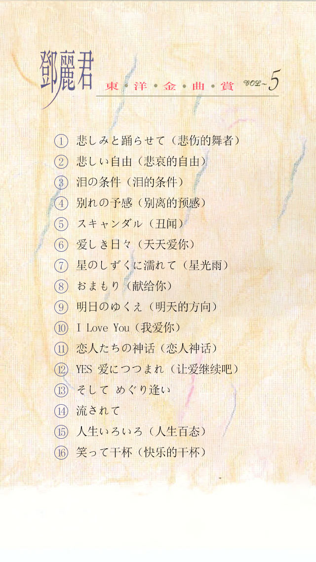 邓丽君,一个时代的传奇。她甜美圆润、温婉动人的声音,温文尔雅、亲切可人的形象,都绝对配的得上20世纪后半叶最富盛名的华语和日语女歌手之名。她那与生俱来的完美音色演绎出无数传唱至今、余韵绕梁的歌曲,聆听她天籁般的歌声可以说是一种非常美妙的享受。这张专辑收录了她16首风格各异的日文歌曲,打开唱片就像打开一盒巧克力,你不知道下一首到底是什么味道。人生在世你总要尝试一下那“百种味道”,如此你才能在绮丽的生活里找到纯真的那个自己,最终笑着为“快乐干杯”!无论您是否是她的歌迷,都不妨碍您拾起这张独一无二的唱片,走近那个时代的传奇,那个时代的声音!