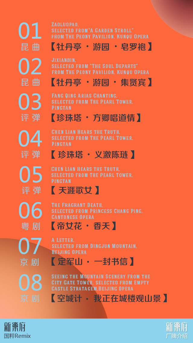 把最传统的,交给最有想象力的,于是肆意生长出【新乐府|国粹Remix】首张合辑,成就真正属于中国的电子音乐。以昆曲的水磨细曲、评弹的吴侬软语、粤剧的起伏婉转、京剧的唱念做打作为引子,四位杰出DJ L+R(王璐)、ZHI16、鹤这豹脾气、Jason Hou调制出各具风格的音乐空间,精妙之处,令人沉溺。传统与现代水乳交融,《调戏》你的全部感官,让人陷入不能预料的沉浸幻景。